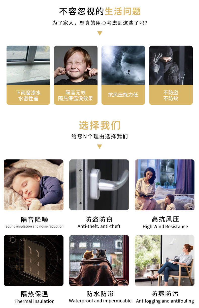 系统窗采用多腔体结构,搭配泰诺风隔热条,密封胶条采用环保级TPE材质,保证了整窗的密封性和水性,从而提高隔音、隔热效果。